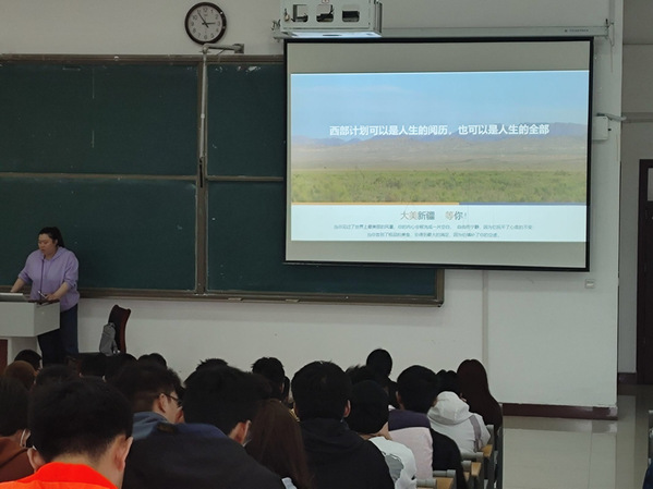 在宣讲会上,辅导员徐可详细介绍了西部计划的政策,为同学们提供了全面的讲解。她表示通过参与西部计划对提升个人能力、增加社会经验、培养责任感方面的提升,为个人成长和职业发展做出贡献的同时,也为西部地区的发展和乡村振兴做出新青年应有的贡献。接着,徐可介绍了近年来学院西部计划的优秀志愿者,讲述了志愿者们丰富的志愿生活以及在工作期间的收获,同学们深切地感受到了志愿者们奔赴西部开展志愿服务的精神。最后,她号召毕业生们要积极西部建设,争当时代先锋,将个人命运与国家发展结合起来,在火热的基层实践中锤炼品德修为,坚定人民立场,厚植家国情怀。