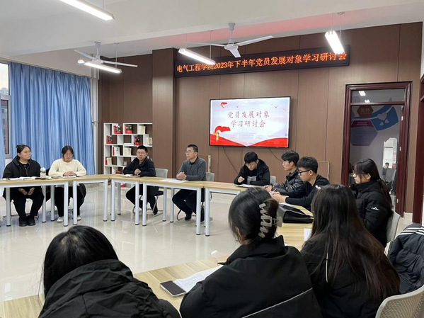 按照校党委组织部《2023年下半年党员发展对象培训工作方案》要求,为巩固培训效果,进一步促进党员发展对象夯实理论基础、端正入党动机、坚定理想信念、明确奋斗目标。2023年11月12日17:00,电气工程学院党总支在11号教学楼310会议室召开2023年下半年党员发展对象学习研讨会,参加会议的有党总支副书记张志、学生第二党支部书记赵建斌、教职工发展对象时小龙、全体学生发展对象。