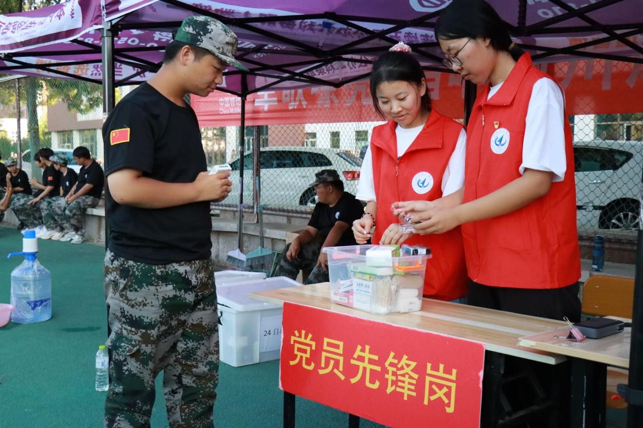 军训期间学生党员们按时到岗、轮流值班、密切关注新生训练动态,关注军训中的各类突发情况,扎实开展新生心理疏导。党员先锋岗既是新生军训服务站,也是补给站。除了学院为新生提供的饮用水、防暑药品等,学生党员还自发从宿舍带过来“创可贴、针线包、小风扇、花露水、便利贴……”等军训神器以备新生们军训不时之需。