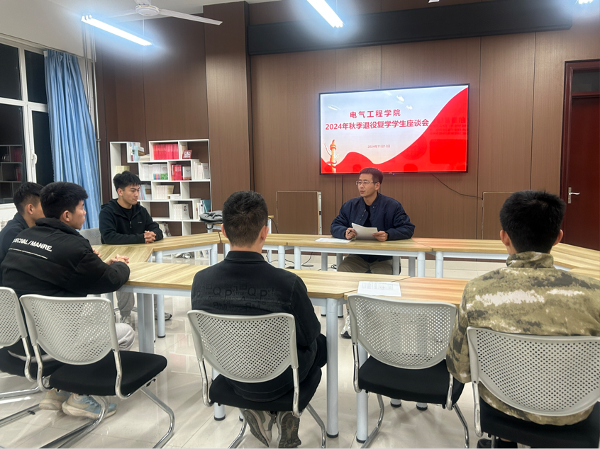 为进一步了解退役复学大学生学习生活和思想状况,帮助他们转变角色,快速适应校园生活。2024年11月12日,电气工程学院在11号教学楼310会议室召开2024年秋季退役复学学生座谈会,学院5名退役复学大学生参加,辅导员李梦超主持。