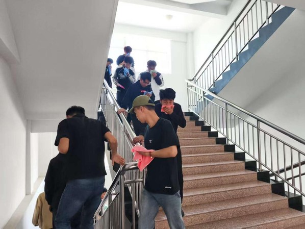 随着火灾警报响起,实战演练正式开始。各楼层负责教师迅速到达指定岗位,全体师生迅速按照疏散方案,用湿毛巾捂住口鼻,低姿弯腰,沿指定安全通道有序撤离至安全区域。整个疏散过程迅速且秩序井然,仅用时3分钟,全体师生便完成安全疏散。到达安全区域后,各班立即清点人数并汇报。
