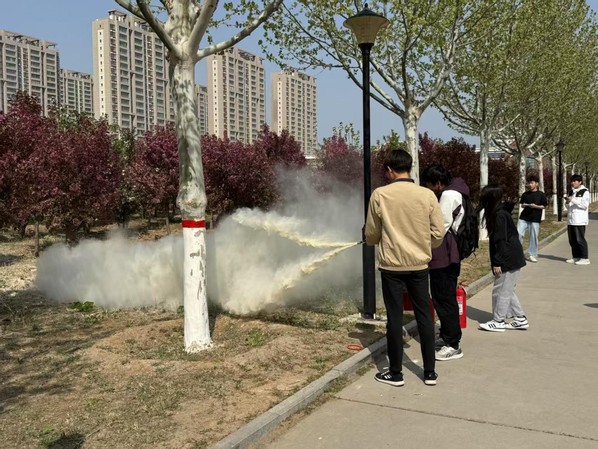 疏散完成后,王亮亮现场为师生们详细讲解了灭火器的种类、适用范围以及正确使用方法,并进行了现场演示。随后,部分师生代表亲自操作灭火器,进行灭火实战演练,在实践中切实掌握灭火技能。