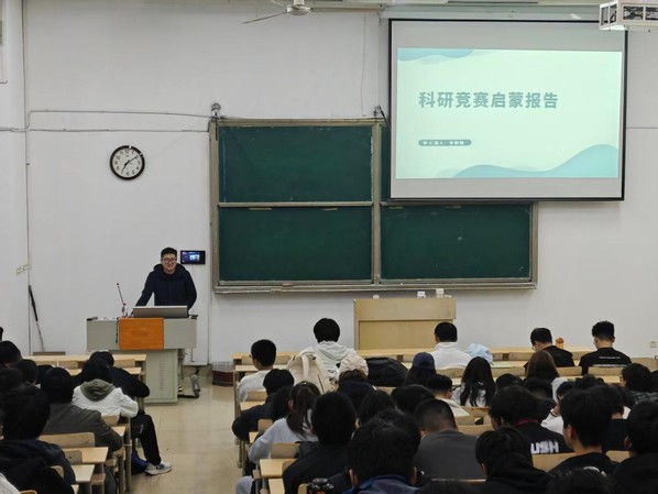 宣讲伊始,商世昌寄语全体新生,科研实践与学科竞赛是锤炼专业本领、培养创新精神的重要平台,也是大学生将理论知识转化为实践能力的关键路径。他希望通过优秀学子的经验分享,帮助新生尽早破除对科研竞赛的“陌生感”,找准成长发力点,在学院“比学赶超”的良好氛围中主动探索、积极成长。分享环节,团队负责人结合自身经历,聚焦科研项目“从0到1”的突破过程,详细讲解了选题调研的方法——如何结合专业热点与自身兴趣锁定方向,如何通过文献检索梳理研究现状;同时分享了团队协作的核心要点,包括任务分工、沟通机制,以及与导师高效沟通的技巧,还以自身克服实验数据异常、优化方案设计的经历为例,让新生直观感受科研过程中的挑战与解决思路。针对新生普遍关心的“备赛与学业冲突”问题,团队负责人还分享了时间分配技巧,鼓励新生以“积累经验、锤炼能力”为目标,勇于尝试各类赛事,在实践中快速成长。